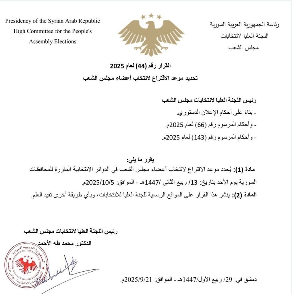 أعلنت اللجنة العليا لانتخابات مجلس الشعب في سوريا وبثتها وكالة الأنباء السورية “سانا” أن الانتخابات البرلمانية ستجري يوم الأحد 5 أكتوبر 2025، الموافق لـ13 ربيع الثاني 1447 هـ، وذلك في مختلف الدوائر الانتخابية بالمحافظات.